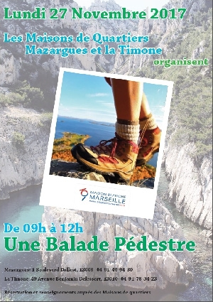 Balade pédestre Lundi 27 Novembre 2017 de 9h à 14h. ![]() Renseignements et réservations auprès des Maisons de Quartier : Mazargues : 1 Boulevard Dallest 13009 Marseille - Tél : 04 91 40 94 30 Timone : 49 Avenue Benjamin Delessert 13010 Marseille- Tél : 04 91 78 34 23 |